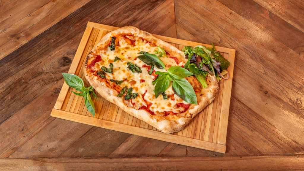 Sauce Tomate San Marzano DOP, Mozzarella Fior di Latte, Basilic frais et huile d’olive extra-vierge DOP.