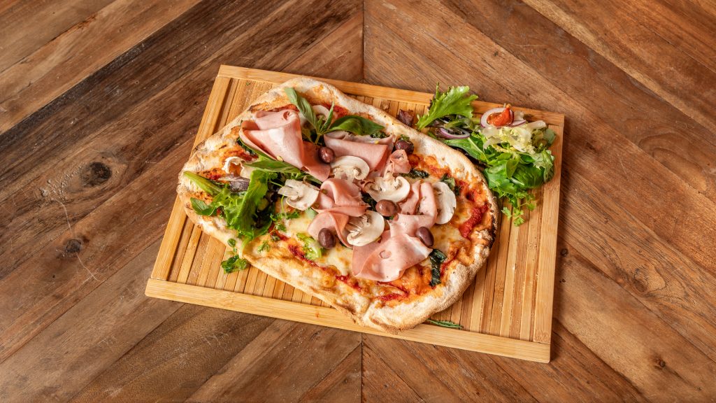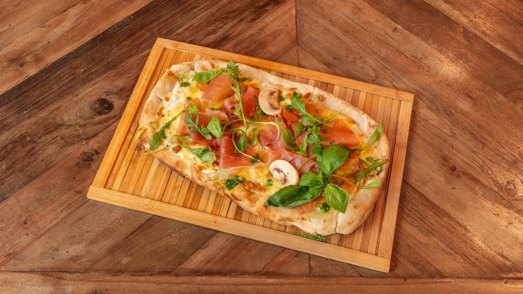 Mozzarella Fior di Latte, champignons de Paris, Jambon Rostello, basilic frais et huile d’olive extra-vierge DOP.